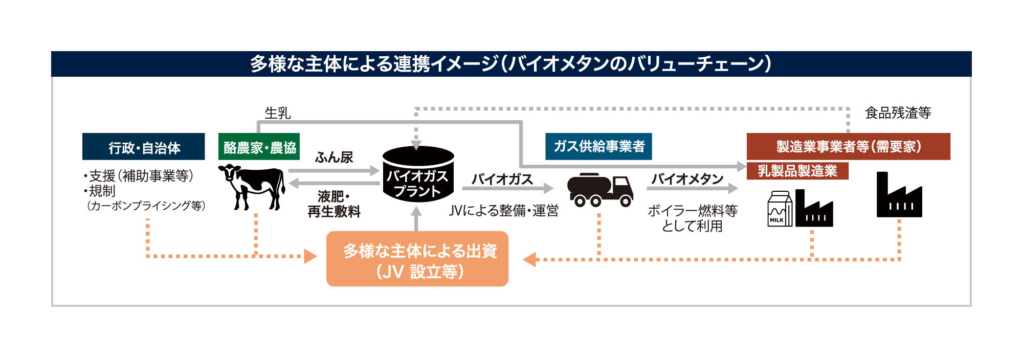 具体的に北海道でどのようなバイオメタンのバリューチェーン構築が可能なのか、供給・需要の両サイドから改めて検討し、酪農家から行政・自治体、ガス供給事業者、乳製品製造業などの需要家まで多様な主体が出資するジョイントベンチャーの設立・運営を提言している。