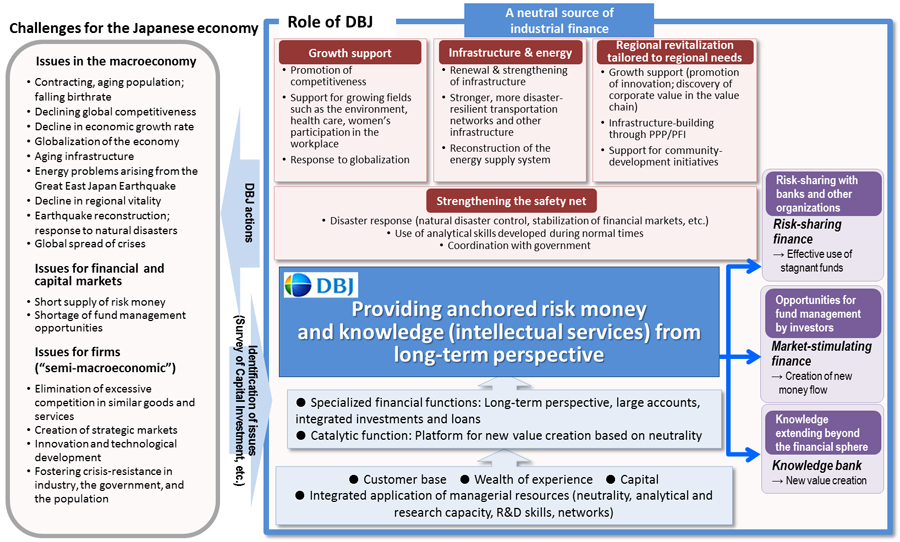 Taking into consideration the intentions of the amendment of the Development Bank of Japan Inc. Act, DBJ will , from a long-term perspective and based on the Third Medium-term Management Plan, continue to address challenges facing Japan by providing adequate risk capital and distinctive knowledge to support Japan’s sustained growth through forming a smoothly functioning financial market together with diverse financial players, supporting the opening up of new business frontiers, and ensuring the viability of communities confronting low birth rates and the rapidly increasing ranks of the elderly and so forth.