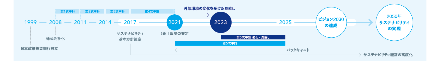 株式会社日本政策投資銀行法における目的規定である「長期の事業資金を必要とする者に対する資金供給の円滑化及び金融機能の高度化に寄与すること」及びDBJグループのサステナビリティ経営に通底する「経済価値と社会価値の両立」という理念を踏まえ、「ビジョン2030」で描く将来像を実現させるための経営上の重要課題をマテリアリティとして特定しています。