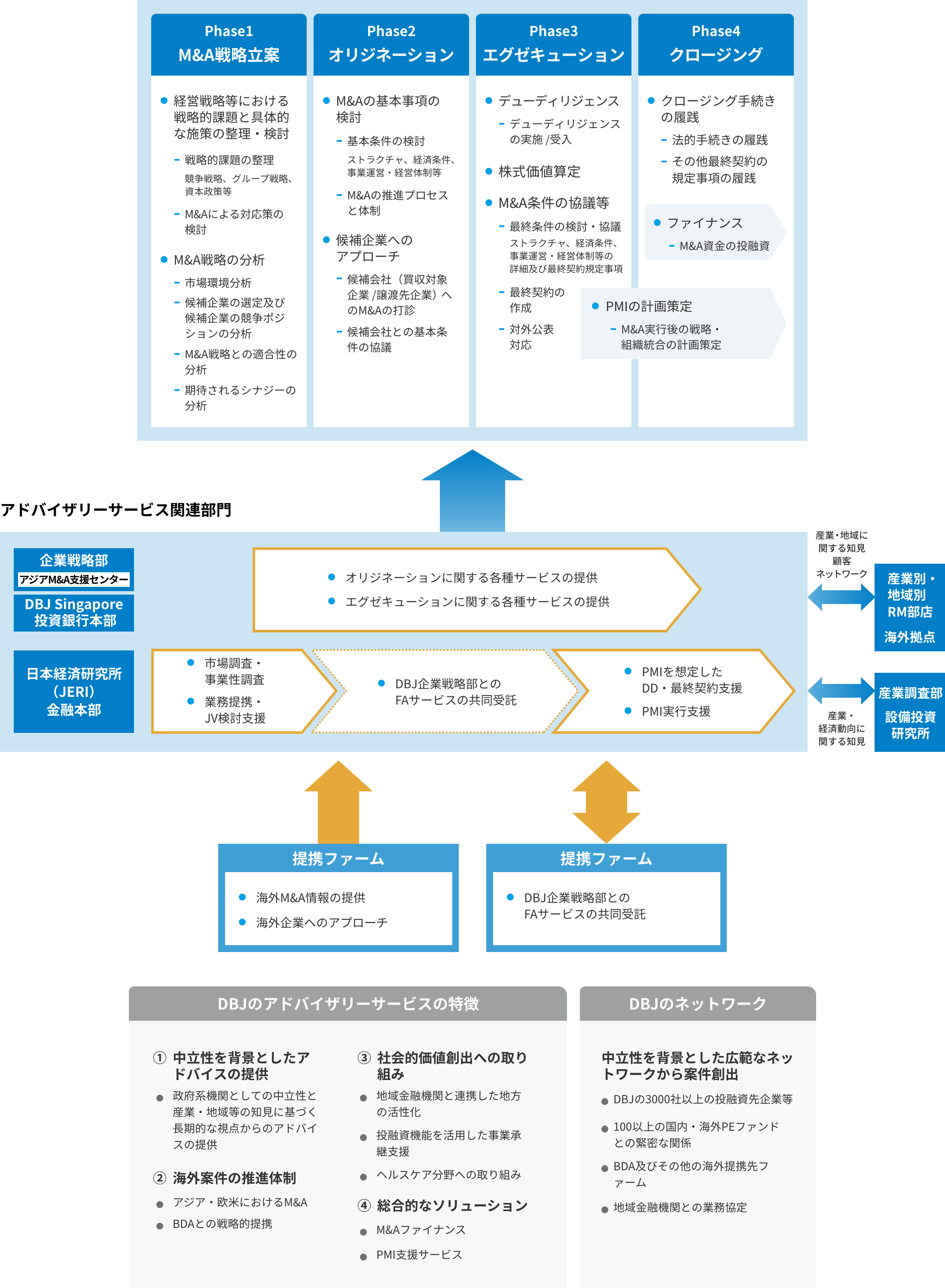 DBJのM&Aアドバイザリーサービスは、「長期的視点や社会的価値創出を意識したアドバイス」「アジアを中心としながら欧米まで広範に対応可能な海外案件の推進体制」「業界分析・市場調査・PMI・M&Aファイナンス等のDBJグループとしての総合的な金融サービスの提供」といった特徴を有しており、企業のさまざまなニーズに対応し、それぞれの経営戦略に合致したM&Aソリューションを総合的に提案・提供します。