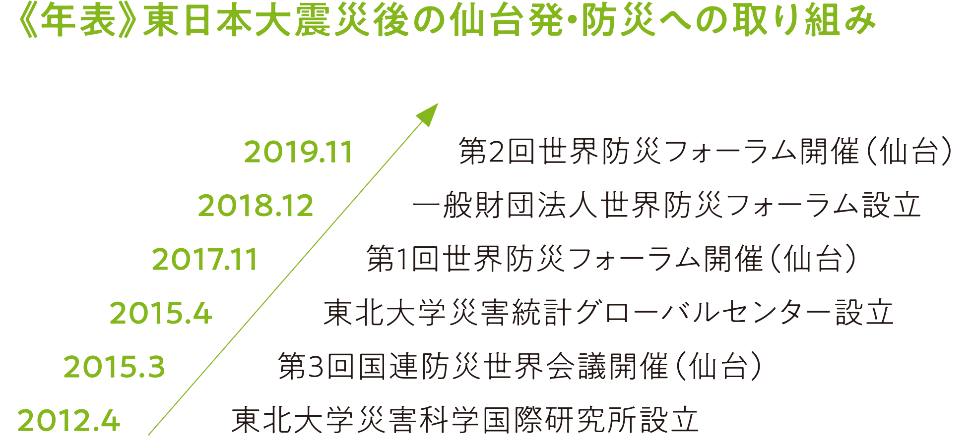 2012年には東北大学に、災害科学の進化と実践的防災学の構築を目指す「災害科学国際研究所」が設立された。2015年には「第3回国連防災世界会議」が仙台で開催され、成果文書として「仙台防災枠組」が採択された。